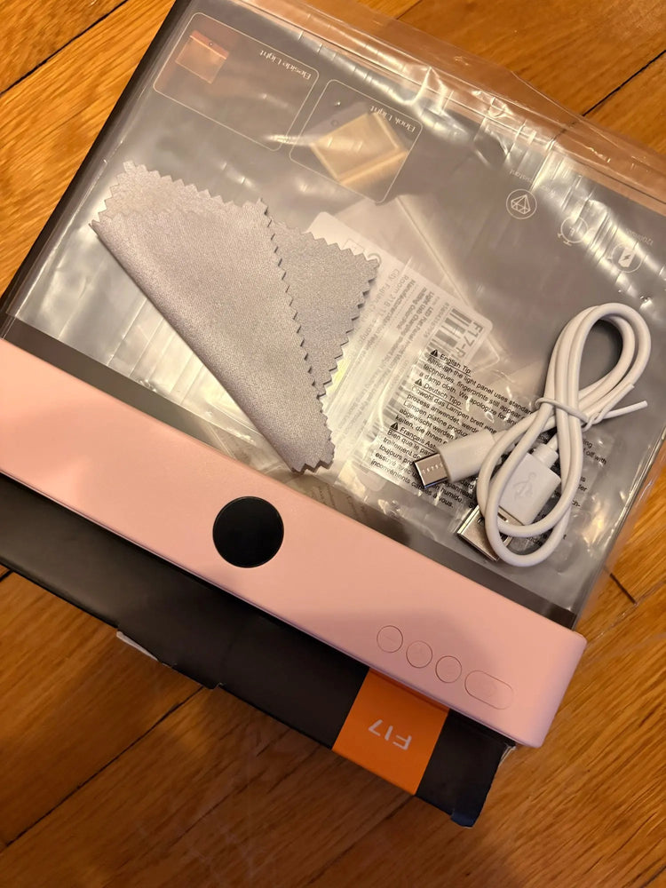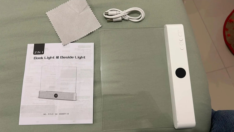 One LumaPage book light, one USB-C charging cable, and a quick start guide. Everything you need to start reading.