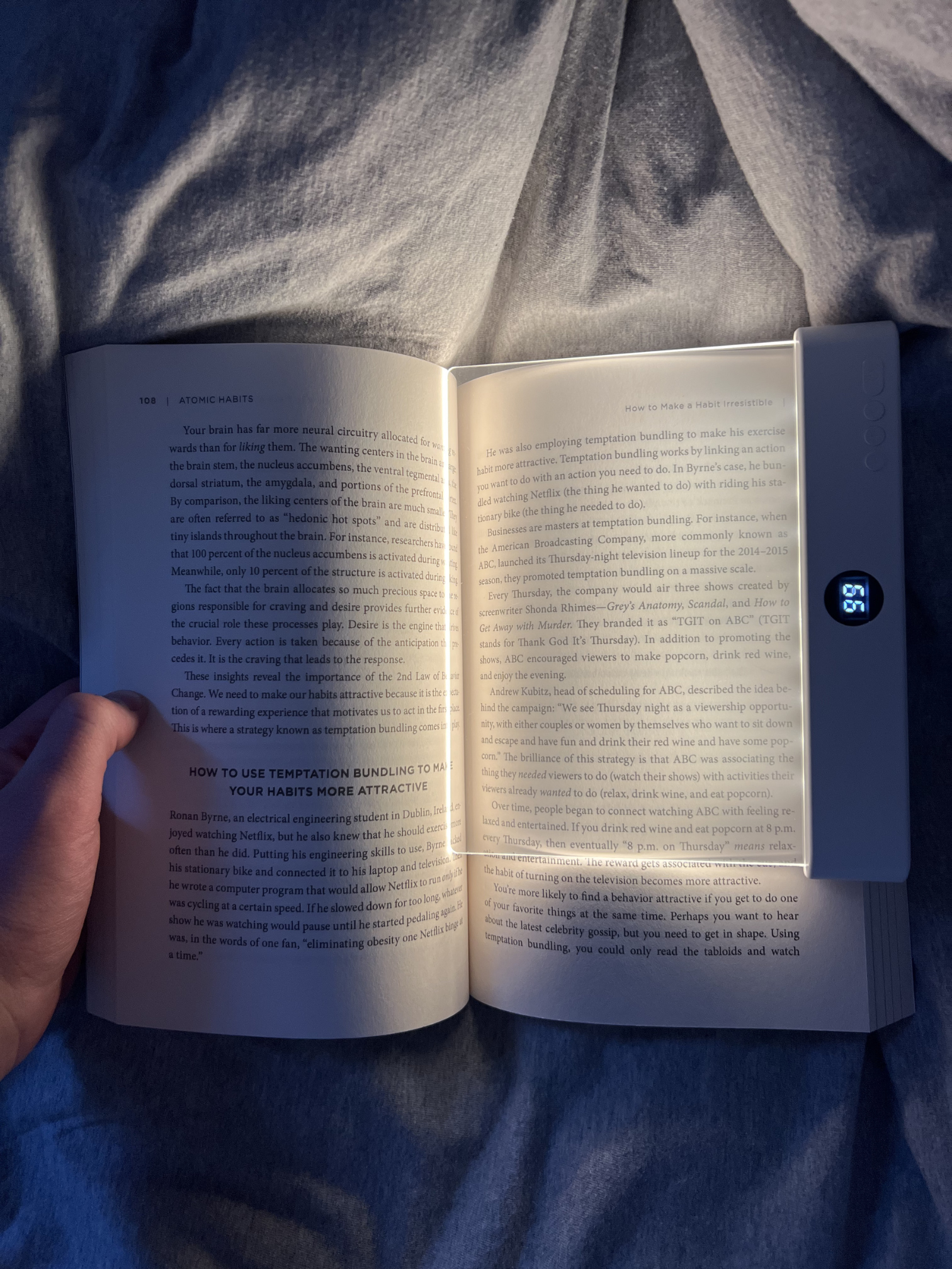 LumaPage is designed to light only your pages, not the entire room. At lower brightness settings, it's gentle enough to use in bed without disturbing anyone next to you.